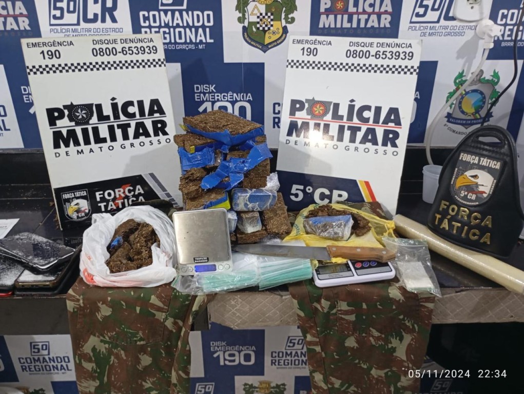 Policiais militares da Força Tática Araguaia prenderam em flagrante dois suspeitos, de 21 e 31 anos, por tráfico de drogas e desobediência, na noite desta