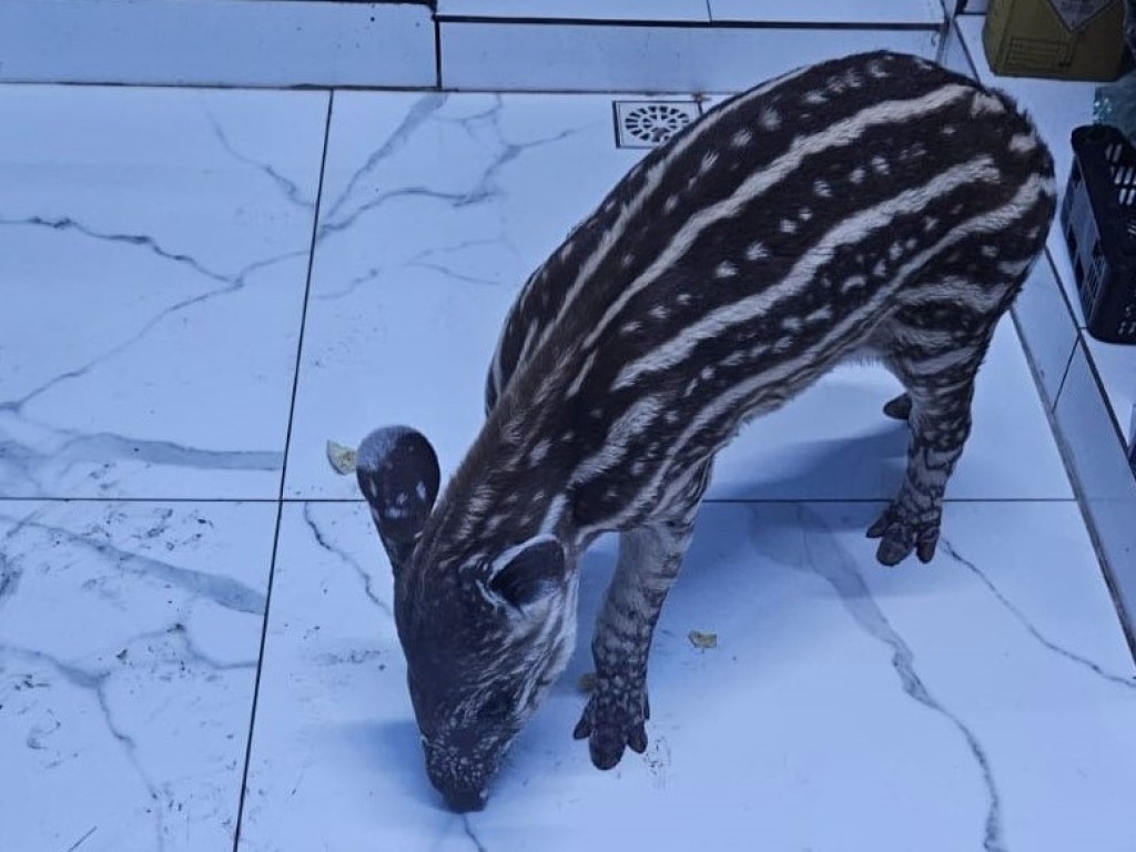 Uma anta filhote que foi resgatada em uma área rural de Ribeirão Cascalheira e passou por atendimento médico veterinário por ferimentos na pele, foi trazida