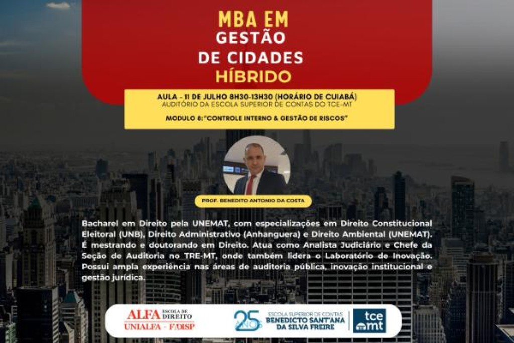 Crédito: Divulgação TCE-MT A aula será ministrada a partir das 8h30, no auditório da Escola Superior de Contas, com transmissão ao vivo pelo canal do