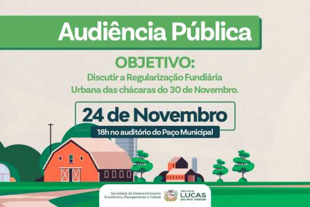 A Prefeitura de Lucas do Rio Verde, por meio da Secretaria de Desenvolvimento Econômico, Planejamento e Cidade, promoverá, nesta segunda-feira (24), a Audiência Pública para discutir a Regularização Fundiária Urbana das chácaras da Comunidade 30 de Novembro. O evento será realizado às 18h, no Auditório dos Pioneiros, localizado no Paço Municipal.