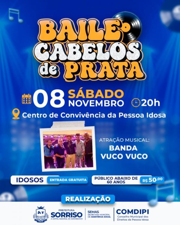A Banda Vuco Vuco promete animar o Centro de Convivência da Pessoa Idosa (CCPI), em mais uma edição do tradicional Baile Cabelos de Prata. A entrada para o evento é gratuita para quem tiver mais de 60 anos, bastando somente apresentar o documento de identidade. Para os menores de 60, é cobrado o ingresso de R$ 50.