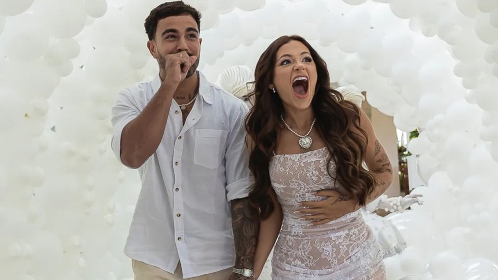 Yuri Meirelles, de 27 anos, e Nathalia Valente, de 20, ex-participantes de A Fazenda 15, realizaram um chá revelação para anunciar o sexo do primeiro bebê dos dois na tarde deste domingo (6).