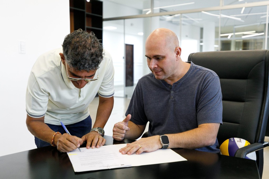 A foto ilustra o prefeito Abilio Brunini, vestido de camisa cinza, sentado numa cadeira almofada de cor preta, assinando um documento que está em cima de uma mesa. Na foto também é possível visualizar um homem de cor parda assinando um documento à caneta.