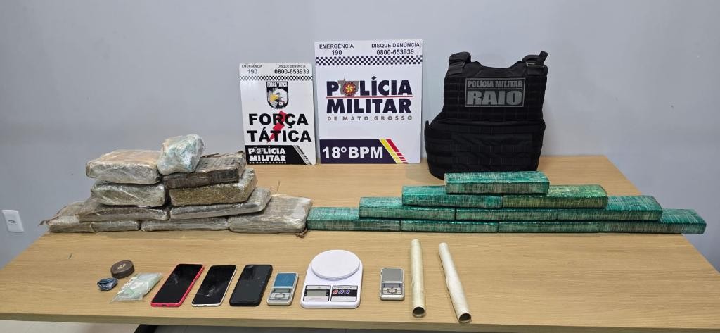 Policiais militares do 18º Batalhão apreenderam, na noite desta quarta-feira (8.10), 20 tabletes de entorpecentes, entre maconha e pasta base de cocaína, e prenderam dois homens em flagrante, suspeitos por tráfico ilícito de drogas, no município de Pontes e Lacerda (445 km de Cuiabá). Ao todo, os ilícitos pesavam aproximadamente 18 quilos.
