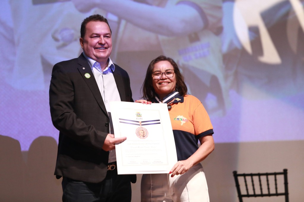 Durante a solenidade, o presidente da Assembleia Legislativa, deputado Max Russi (PSB), entregou a Comenda Marechal Cândido Rondon à presidente da Confederação Nacional dos Agentes Comunitários de Saúde (CONACS), Ilda Angélica dos Santos Correia, em reconhecimento à sua atuação em defesa dos direitos dos agentes de saúde em todo o Brasil.