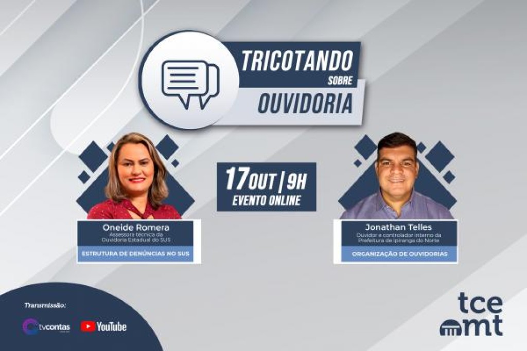 O funcionamento, atuação e objetivos da ouvidoria do Sistema Único de Saúde (SUS) será o tema central do Tricotando sobre Ouvidoria do próximo dia 17 de outubro. O encontro online realizado trimestralmente pelo Tribunal de Contas de Mato Grosso (TCE-MT), por meio da Ouvidoria-geral, será transmissão ao vivo pela TV Contas (canal 30.2) e pelo Canal do TCE no YouTube, a partir das 9h.