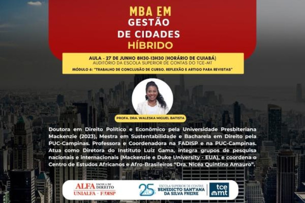 O 6° módulo do MBA em Gestão de Cidades do Tribunal de Contas de Mato Grosso (TCE-MT), que será realizado a partir das 8h30 desta sexta-feira (27), abordará metodologia de pesquisa e Trabalho de Conclusão de Curso (TCC). A aula será no auditório da Escola Superior de Contas, com transmissão ao vivo pelo Canal do TCE-MT no YouTube e pela TV Contas (Canal 30.2).
