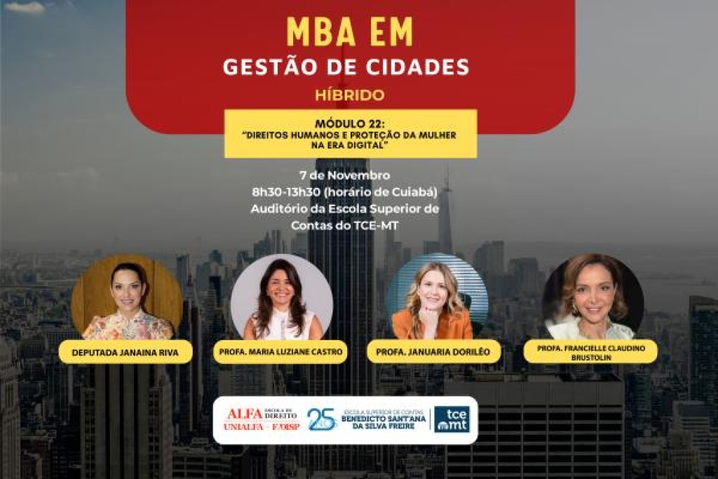O fortalecimento dos direitos humanos e a proteção da mulher em ambientes digitais estarão em pauta no 22º módulo do MBA em Gestão de Cidades, promovido pelo Tribunal de Contas de Mato Grosso (TCE-MT). O encontro, que será nesta sexta-feira (07), às 8h30, no auditório da instituição, contará com a participação da deputada estadual Janaina Riva, primeira mulher a presidir a Assembleia Legislativa de Mato Grosso (ALMT), e reunirá representantes dos Poderes Legislativo e Judiciário.