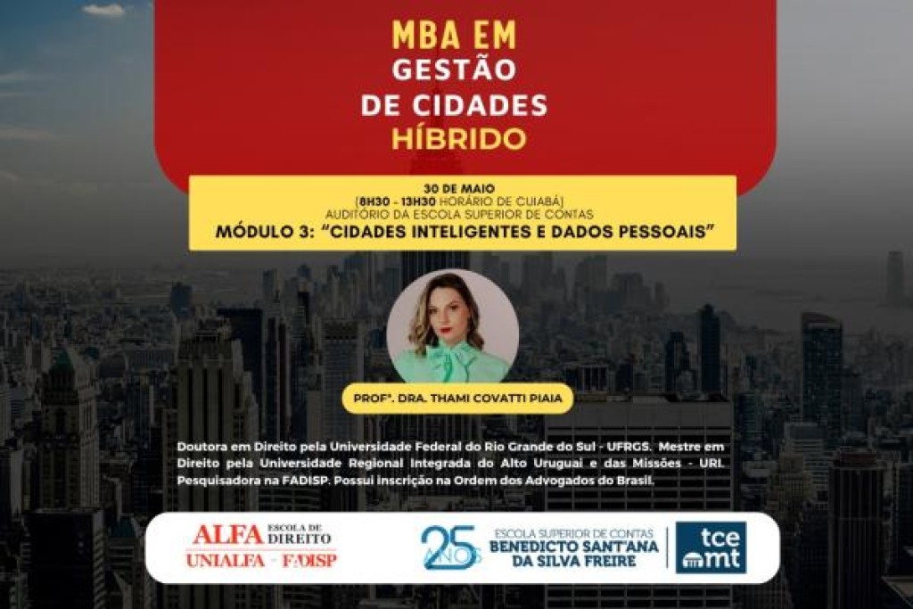 A pesquisadora e doutora em Direito Thami Covatti Piaia estará à frente do módulo Cidades inteligentes e Dados Pessoais do MBA em Gestão de Cidades do Tribunal de Contas de Mato Grosso (TCE-MT) desta sexta-feira (30). A terceira etapa da pós-graduação será das 8h às 13h, no auditório da Escola Superior de Contas.