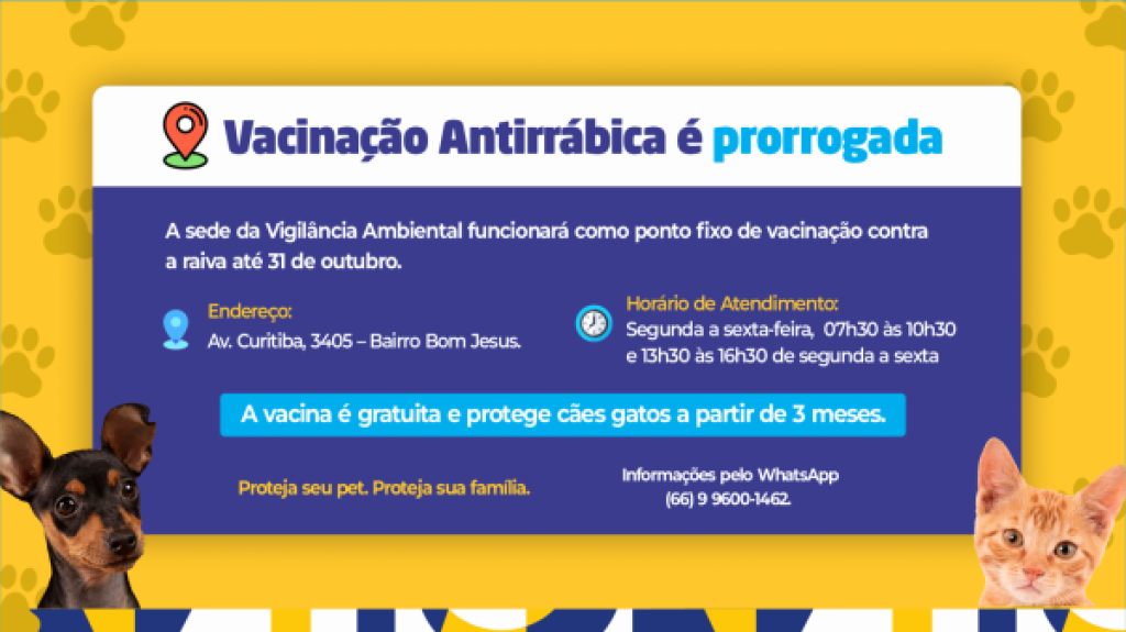 “A prorrogação é uma oportunidade para que nenhum pet fique sem proteção. Sabemos que muitas famílias têm rotinas corridas e, por isso, estendemos o prazo até o fim de outubro. A raiva não tem cura, mas pode ser prevenida de forma simples com a vacinação. Cada dose aplicada representa uma atitude consciente, que evita riscos à saúde coletiva e garante qualidade de vida para os animais de estimação”, destacou.